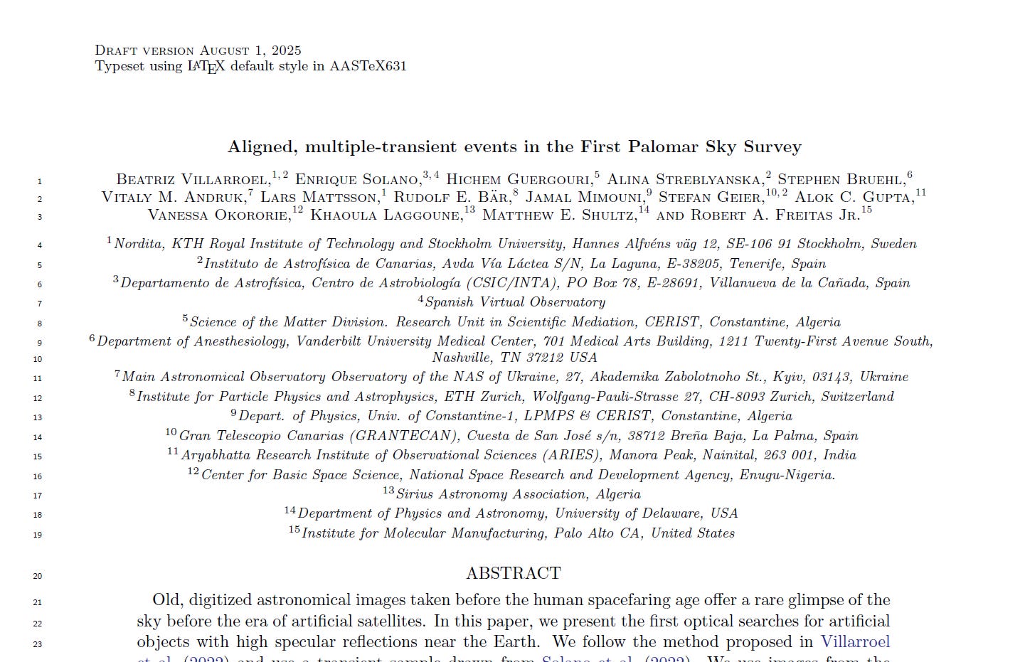 The draft of a new paper by Dr. Beatriz Villarroel et al., Professor of astrophysics at the Nordic Institute for Theoretical Physics (Nordita -Stockholm University ):